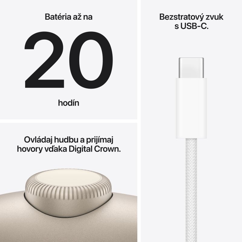 AirPody Max 2 sú navrhnuté pre neporovnateľné pohodlie a optimálne akustické utesnenie. Ich zvuk ťa úplne pohltí. Stlačením korunky Digital Crown pustíš alebo zastavíš hudbu, urobíš fotku alebo video, vypneš alebo zapneš mikrofón pri hovore. Dvojitým stlačením preskočíš na inú skladbu alebo ukončíš hovor. A otáčaním presne nastavíš hlasitosť. Klenba hlavového mosta je vyrobená z priedušnej textilnej sieťoviny a rovnomerne rozkladá váhu slúchadiel. Náušníky z akustickej pamäťovej peny sú potiahnuté špeciálnou textilnou sieťovinou. Dokonale sedí, čo je základný predpoklad fantastického zvuku. Mušle majú krásne prevedenie z anodizovaného hliníka a mechanizmus, ktorý umožňuje ich nezávislé otáčanie a vyrovnávanie tlaku. Vysúvacie ramená hladko vychádzajú z nerezového rámu a stabilne držia v nastavenej polohe. Slúchadlá tak pohodlne sedia a presne doliehajú.